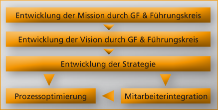 Die Strategie ist von den Mitarbeitern für die Mitarbeiter entwickelt. Die Prozesse sind aus der Strategie abgeleitet und von den Mitarbeitern gestaltet. Sie beschreiben, was und wie ein Mitarbeiter tätig werden soll, sind handlungsorientiert beschrieben und schließen potentielle Fehlerquellen nahezu aus. Potentielle Demotivatoren werden bei der Entwicklung der Strategie und der Prozesse im Vorfeld ausgeschlossen. Die Strategie und die Prozesse sind gemeinsam entwickelt worden, werden somit gemeinsam getragen und nachhaltig umgesetzt. |